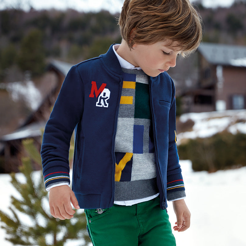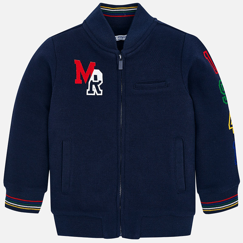 Bomber style jacket for boy with a central zip down the length of the jacket. There are pockets on the sides and printed designs on the front and sleeves of the jacket.